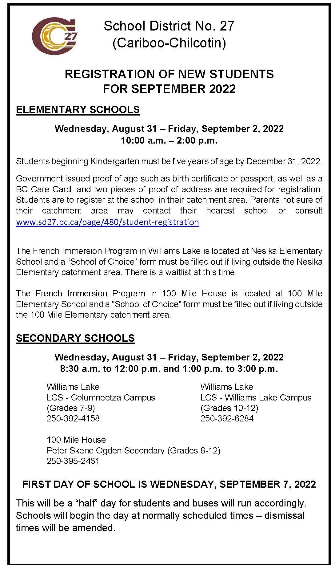 Government issued proof of age such as birth certificate or passport, as well as a BC Care Card, and two pieces of proof of address are required for registration. Students are to register at the school in their catchment area. Parents not sure of their catchment area may contact their nearest school or consult www.sd27.bc.ca/page/480/student-registration